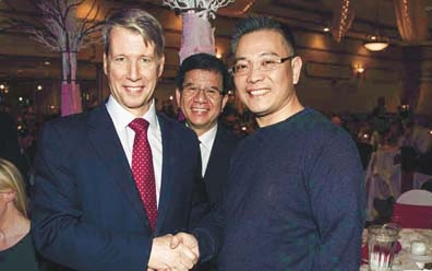 今年1月18日,程慕阳(右)在温哥华自由党筹款活动时,与自由党议员候选人握手。(加拿大《星岛日报》资料图)