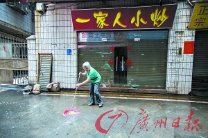 死者在大街上倒地不起,附近街坊在死者倒地处清理血迹。广州日报记者苏俊杰 摄
