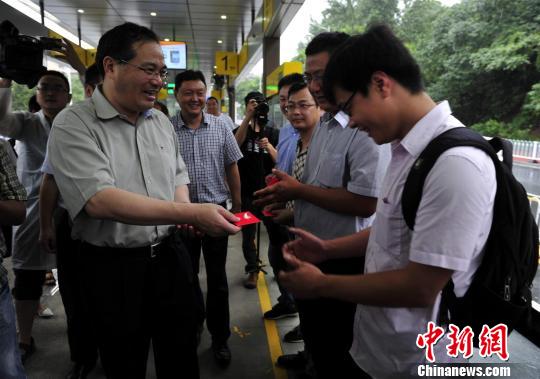 宜昌市长马旭明(左)向市民派发公交卡 刘良伟 摄