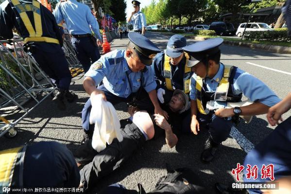 地时间2015年7月15日,日本东京,民众在国会前集会示威,抗议安倍政府推出的新安保法案。部分示威者与警方发生冲突。