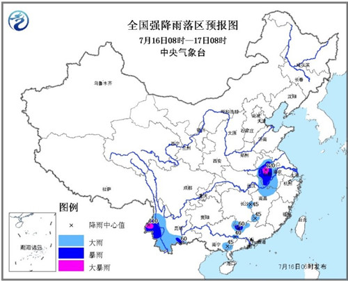 中新网7月16日电 据中央气象台网站消息,中央气象台7月16日6时发布暴雨蓝色预警,预计,7月16日08时至7月17日08时,河南东南部、湖北东部、安徽大部、江西北部、广西东部、云南西部等地有大雨或暴雨。