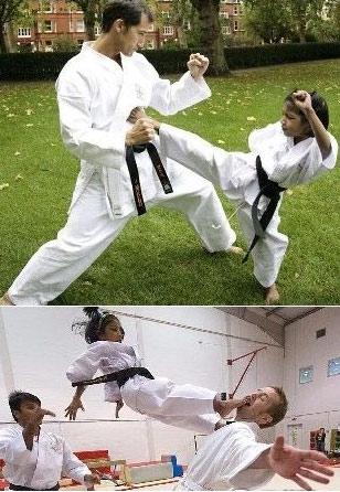 2009年10月,场地的一边,站着身高1米80的记者大卫·洛威;另一边站着身高不到1米、只有5岁的印度女孩瓦尔莎·维诺德。随着“裁判”的一声令下,“比赛”开始。瓦尔莎迈开脚步全力往前冲,然后飞身跃起,一脚踢中对方的下巴。啪,洛威应声倒地……要知道,瓦尔莎两岁就拜老爸为师开始学习空手道,5岁通过了黑带资格认证考试,把世界纪录一下子“提前了两岁”,成为了最年轻的空手道黑带。