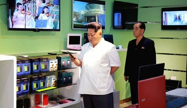 图为金正恩正在机场销售电子产品的商店视察。