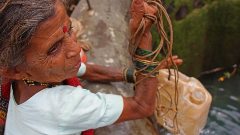 他们生活的地方是丘陵地带,与其他村镇隔离且远离水源。在炎热干燥的季节,村里更是缺水严重,许多家畜都渴死了。解决问题的唯一办法就是到水源地去取水回来,但是单程取水一次大约需要12小时,Tuki说她不能离开孩子那么久去运水。她说丈夫别无选择,只好再娶第二、第三位妻子用来取水,这样她就可以留在家里照顾孩子。丈夫Sakharam说:“因为缺水,我只是做了我该做的。”图为第二位妻子Saakhri在水源地打水。