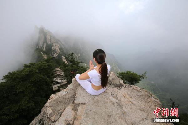 美女悬崖边练瑜伽 烟雾弥漫宛若仙女下凡