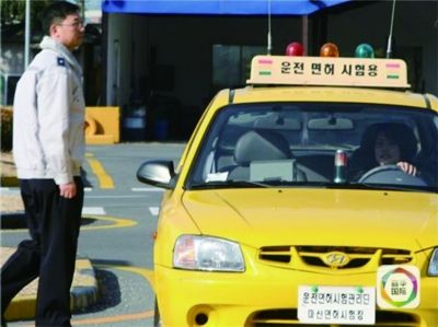 韩国某驾校培训场景,黄色车上写着“驾照考试用车”。