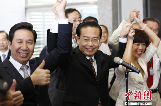 福建省省长苏树林率福建经贸参访团访问金门。在苏树林和金门县长陈福海等人的见证之下,供水工程两岸业主单位就供水项目完成签约。 中新社发 石龙洪 摄