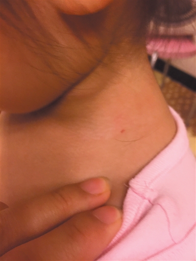 “她说我女儿也被扎了,让我赶紧看看。”女孩珍珍(化名)的母亲宫女士检查孩子身体后发现,珍珍脖子左侧有一个红色的小眼,疑似针眼。