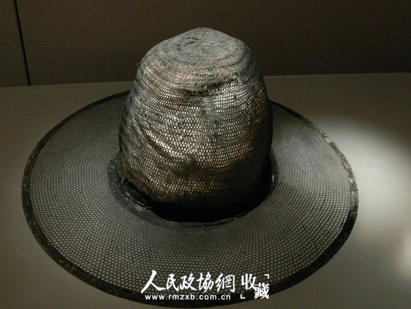 圆檐高顶藤帽。表有黑色织物,圆顶,高17厘米、檐宽41厘米。
