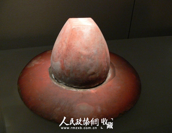 圆檐高顶红漆帽。小方顶,高17厘米、檐宽43厘米。帽练贯六棱木雕和小圆珠各12枚。