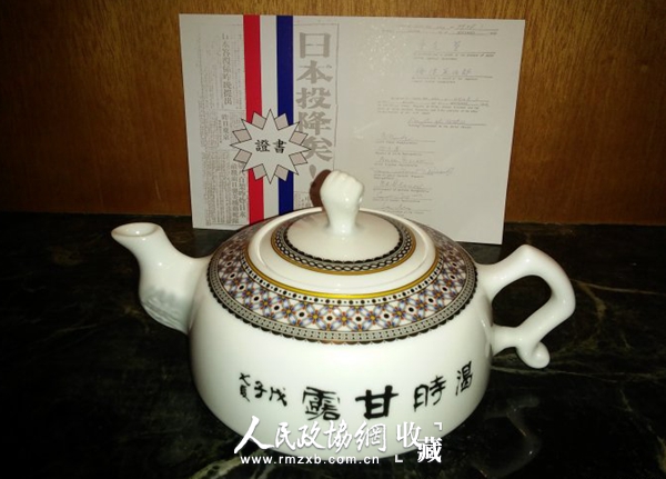 “笔者藏有一把抗战胜利壶(见图),壶盖顶形一只手,五指紧握,象征全国人民团结一致,抗日斗争。壶嘴下端呈圆形,两旁镌印“胜利”两字。此壶是抗战胜利后,景德镇特制,以志纪念。壶面题有“渴时甘露”四字,品茗时耐人寻味。此壶原主乃是我国著名教育家、书画家吕凤子(1885—1959)旧物,“凤子先生清玩”,字迹隐显。七十年代初,笔者在淮海中路华亭路旧货摊上购而藏之,朝夕相处。今年恰逢反法西斯战争胜利五十周年,笔者出生于1945年8月10日,正值抗战胜利的前夕。真是与胜利壶有缘。(唐余安)。”