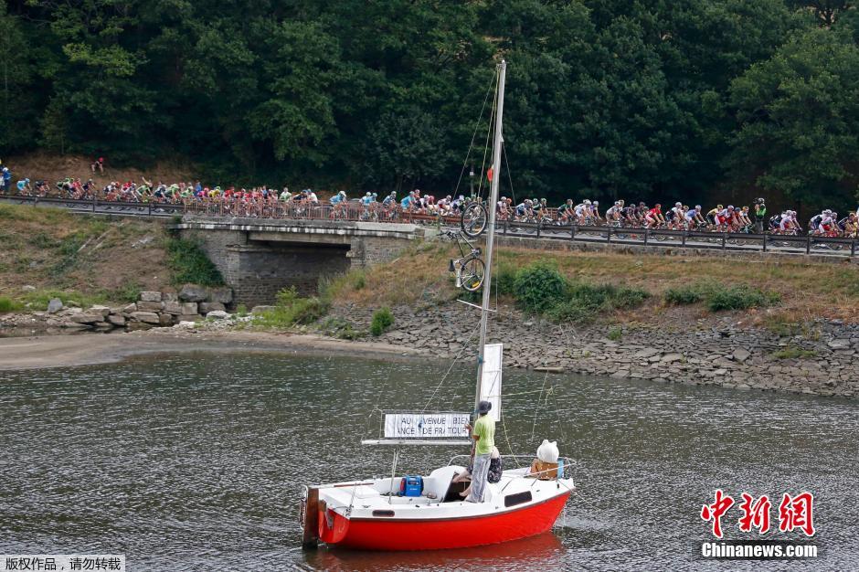 7月18日,第102届环法自行车赛持续进行,热情的自行车迷在自家的帆船上为选手加油助威。
