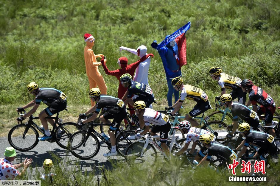 7月15日,环法自行车赛继续进行,几位打扮另类的车迷在赛道边为选手加油助威。