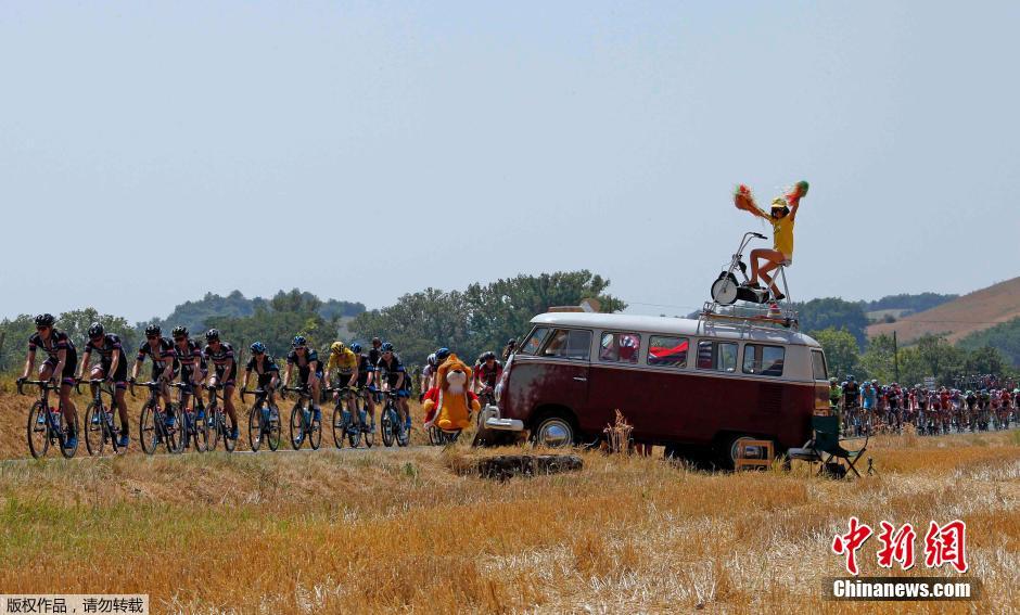 7月17日,第102届环法自行车赛持续进行,热情的自行车迷在场边加油助威。