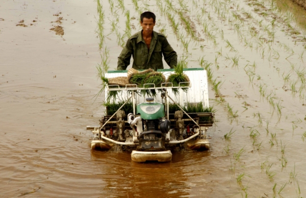 7月23日,江西省靖安县仁首镇石下村农民在机插晚稻。