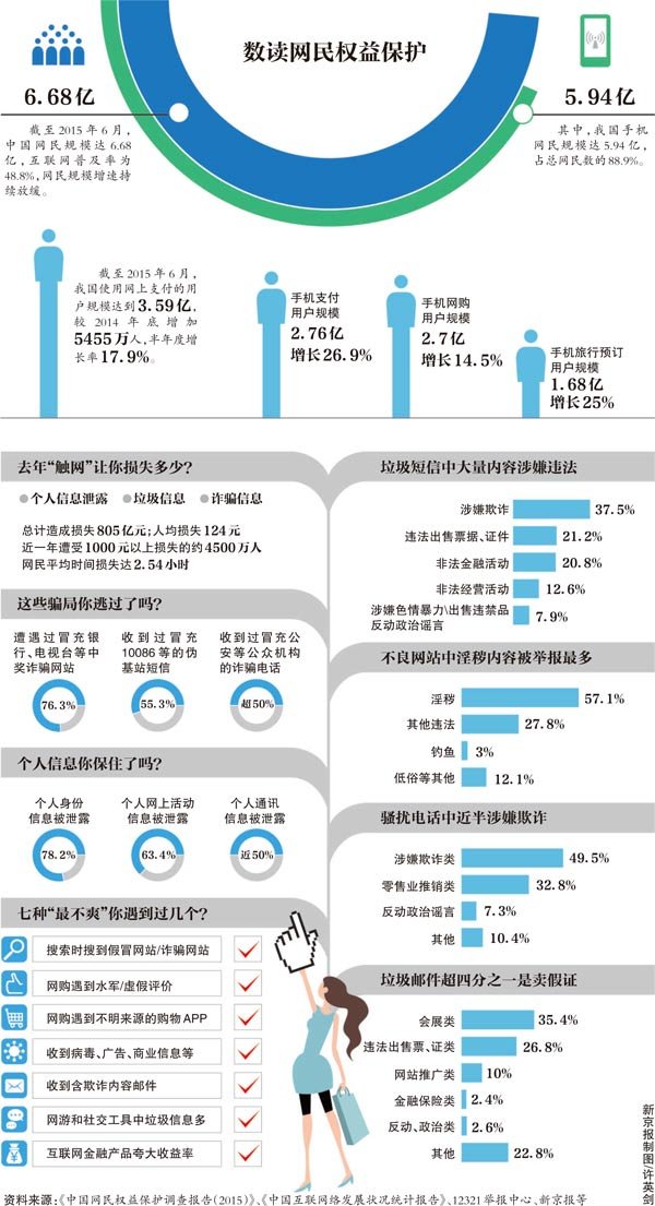 《中国网民权益?;さ鞑楸ǜ妫?015)》发布;近八成网民个人信息被泄露过
