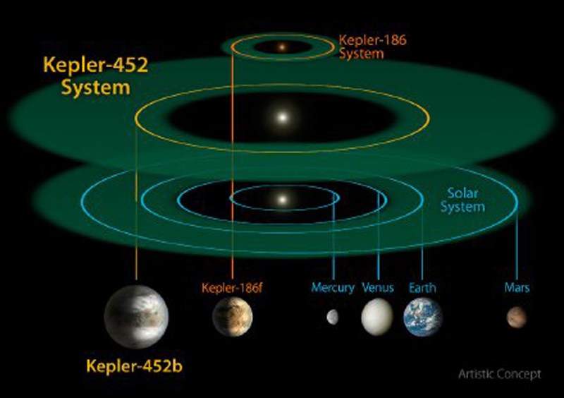 这颗行星距离地球1400光年,绕着一颗与太阳非常相似的恒星运行。那颗恒星的质量比太阳多4%,亮度则要多出10%。开普勒452b到那颗恒星的距离,跟地球到太阳的距离相同。图为开普勒望远镜之前发现的kepler-186星系与kepler-452b所在的星系,我们的太阳系比较。 Kepler-186系统的恒星因为比太阳小很多,所以它的主要行星几乎都很靠近恒星,大约和我们太阳系的水星轨道相当。