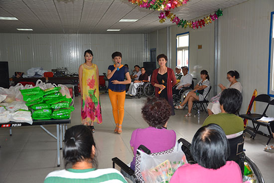 康复村现有住户25户,都是高位截瘫居民,前来义诊的农工党医疗专家和这里的每一位居民都已是老朋友了,大家一见面就亲热地聊了起来,专家们认真询问居民们的健康情况,详细为大家讲解截瘫病人夏季多发病的保健常识,反复叮嘱要注意夏季防暑降温。有些居民行动不便,不能来到集中义诊室,专家们专程到家中为他们看病。市委会为每位居民送去了米、面、银耳等慰问品,共计1万余元。文体支委会主委、国家一级演员、梅花奖获得者罗慧琴带领弟子,为居民精心准备了评剧、歌曲等精彩节目,康复村村长杨志喜深情演唱了歌曲《献给妈妈的爱》,罗慧琴师徒三人的评剧《花为媒》选段“报花名”和《刘巧儿》选段“采桑叶”联唱将活动推向了高潮,赢得了居民阵阵掌声。