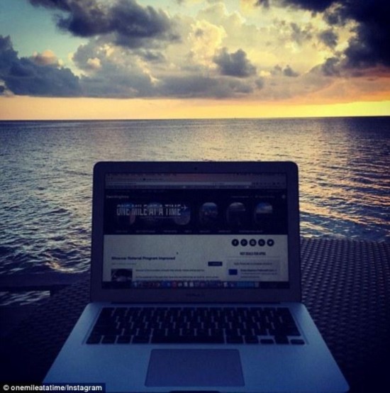 后来斯拉皮格进入佛罗里达大学学习市场营销,但他看起来对此并没有太大的兴趣。在进入大学几个月之后,他开了一个名为“一次一英里”(One Mile at a Time)的博客,开始讲述他的一些飞行经历。图为最近在马尔代夫停留时写博客的照片。