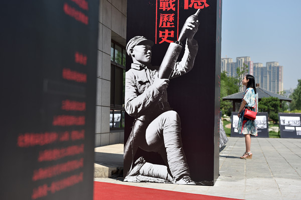 7月25日,一名参观者在参观展出图片。当日,为纪念抗日战争胜利70周年,“国家记忆暨三晋抗战历史影像展”在山西省太原市汾河景区免费开展。展览共选取200余幅图片,展示了抗日战争时期中国军民全面抗战的英勇事迹。新华社发_副本
