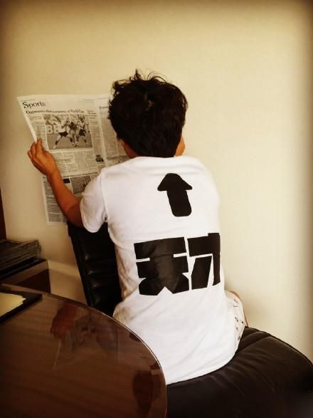 7月27日,王宝强在微博上晒出一张自己坐在椅子上看报纸的照片。照片中王宝强身穿“天才”体恤,还有一个醒目的箭头指向脑袋。照片的亮点不仅如此,宝宝手上拿着全英文报纸更是让大家目瞪口呆。