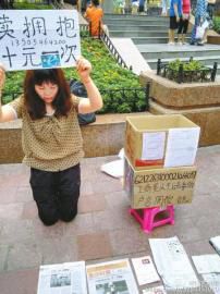 重庆朝天门,陈得娟在街头跪地卖拥抱,希望为孩子筹款治病。重庆朝天门,陈得娟在街头跪地卖拥抱,希望为孩子筹款治病。