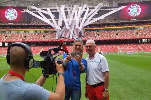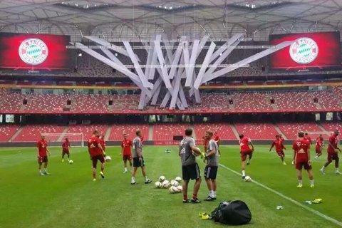 在日前鸟巢举办的足球比赛中,该道具为主场背景,位于赛场内两块LED大屏幕中间,多名队员及教练曾与其合影留念。