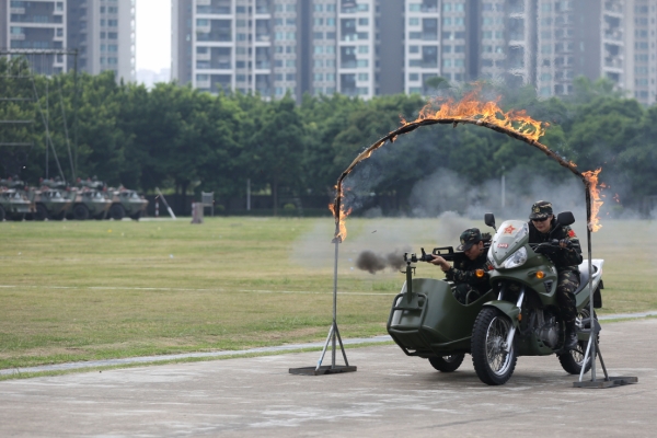 驻澳门部队演练女子摩托车驾驶(2015年7月13日摄)。