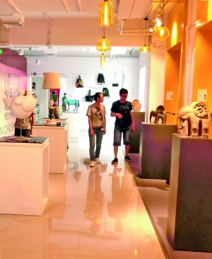 就这样,双方一拍即合,商业体和文化体有机结合,艺术品和创意品合理配搭,成为南锣鼓巷独特的一景儿,双方还合力起了个充满朝气的名字——少年心气。店铺业主,游人旅客,老街的居民,都能够借此机会近距离接触美院青年艺术家的优秀作品。一边是青年艺术家与艺术作品,一边是繁华的世俗街景与攒动的人群,这一次不再是单向的展览与观看,而是艺术与商品消费的融合——艺术品消费空间。