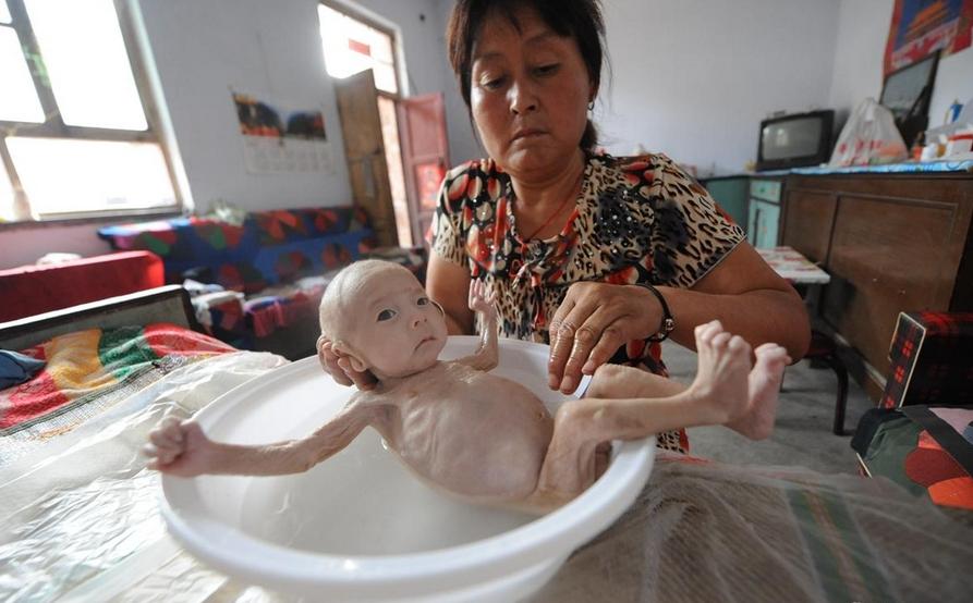 7月27日,山西长治市壶关县桥上乡川底村,出生80天的郭恩泽先天无肛,四肢萎缩得只剩皮包骨头,排泄系统紊乱的他肚子微微隆起,身体到处是血青色,形状酷似“外星人”,体重从出生时的5斤变成了4斤8两,生命垂危急需手术。