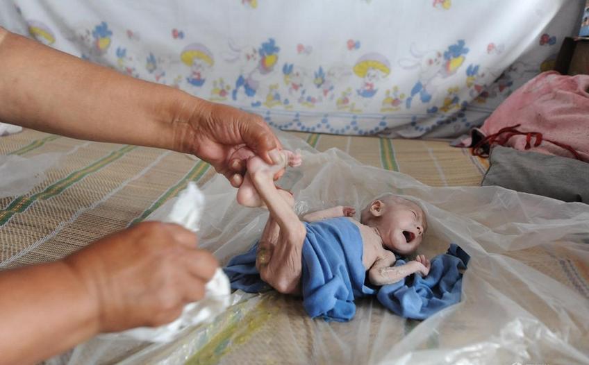 “肛门再造”手术需要大笔费用,一贫如洗的一家人绝望地带着孩子从医院回到家中。孩子父亲眼含热泪转身到城里打工,因为治病需要很多钱。图为吃了奶的小恩泽,终于艰难的排出了粪便,而由于身体缺陷,每次排便都令他痛苦不堪。
