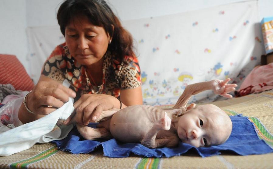 小恩泽四肢萎缩得只剩皮包骨头,排泄系统紊乱的他肚子微微隆起,身体到处是血青色。