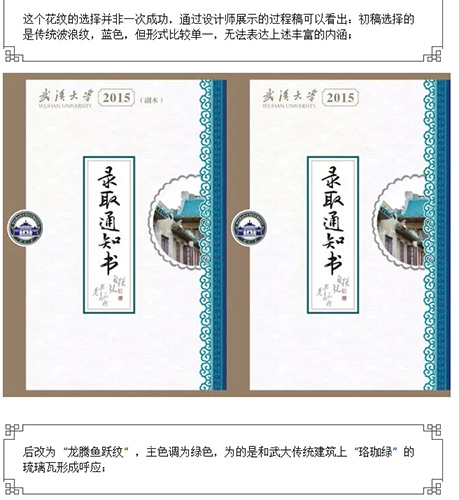 文章还从两校通知书的设计理念进行解读,称武大强调学生个性化发展,倡导自由理念。设计者用“龙腾鱼跃纹”表达这种个性,为突出喜庆色彩,调整为红色基调。人大则主要使用“海水江崖纹”,以表达其“国民表率”、“社会栋梁”的人才培养理念。