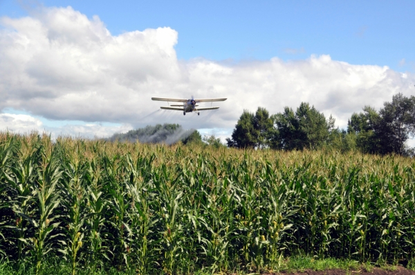 7月29日,位于黑龙江省北安市的黑龙江垦区建设农场用飞机为玉米喷施营养液。