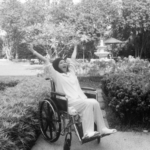 如此长时间的卧床,真的难为女神了!不过女神也很乐观,6月时她曾在脸书上贴出一张吊盐水的照片,并表示长期卧床练就了“新技能”:“钢铁V现在对单手刷牙洗脸吃饭很熟练了!你也是‘钢铁李V宝’、不要怕!有妈咪在,我们一定可以撑过的!?。?rdquo;
