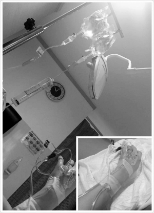 高龄孕妇徐若瑄秀出自己吊针的照片。