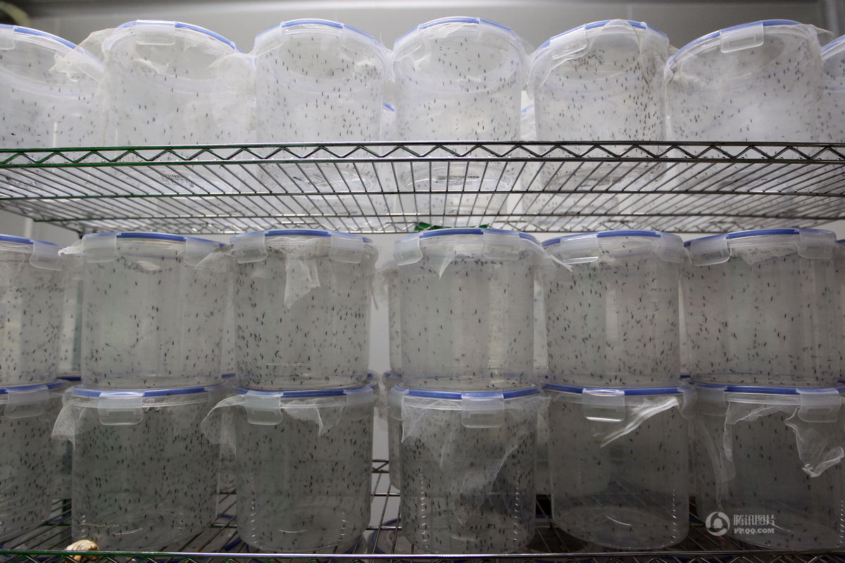 广州市萝岗区高新技术产业开发区科学城加速器园区的一栋大楼内,藏着目前世界上最大的蚊子工厂。每周,这里生产出50万甚至上百万只“绝育”蚊子,被送往广州南沙沙仔岛释放。图为等待释放的一罐罐雄蚊,每罐大约500只。南方都市报 马强 实习生 肖睿弘/摄