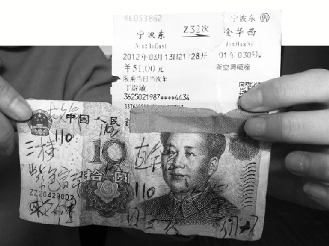 一张贴着火车票的10元纸币,上面写着很多“救命”
