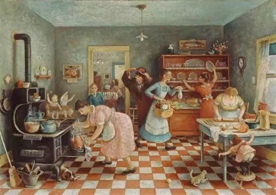 “美国的一个不甚著名的女画家所作的《感恩节》,那却是绝对属于现代文明的。画的是一家人忙碌地庆祝感恩节,从电灶里拖出火鸡,桌上有布丁,小孩在桌肚下乱钻。粉红脸,花衣服的主妇捧着大叠杯盘往饭厅里走,厨房砖地是青灰的大方块,青灰的空气里有许多人来回跑,一阵风来,一阵风去。据芝加哥艺术学院的SarahKellyOehler介绍,该画完成的时期正值美国大萧条前后,画家通过感恩节熟悉的饮食与环境,用乡愁将大劫过后的美国人联系在一起。
