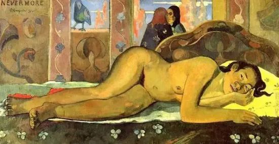 “一个夏威夷女人裸体躺在沙发上,静静听着门外的一男一女一路说着话走过去;门外的玫瑰红的夕照里的春天,雾一般地往上喷,有升华的感觉,而对于这健壮的,至多不过三十来岁的女人,一切都完了。女人的脸大而粗俗,单眼皮,她一手托腮,把眼睛推上去,成了吊梢眼,也有一种横泼的风情,在上海的小家妇女中时??梢钥吹降?,于我们额为熟悉。这高更第二次赴塔希提岛时的作品,也是他的代表作之一。高更曾说:“我想一个简单的肉体可以唤醒长久遗失的蛮荒狂野中的奢华”