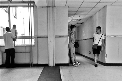一楼挂号完毕后,位于诊室门口其他号贩子则表示需要和医生确认加号事项,如果加号成功便可交钱,其他时间他们会在楼梯口守株待兔招揽生意,如果有患者露出买号的意思,他们便自信满满地表示可以轻松搞到专家号,画面右侧二人为号贩子。