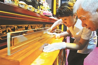 房山云居寺昨天上午迎来了新宝贝,获赠素有“佛教熊猫”之称的宋代《贝叶经》?!侗匆毒方谠凭铀路鸾涛幕构葜姓钩?,供游人欣赏。