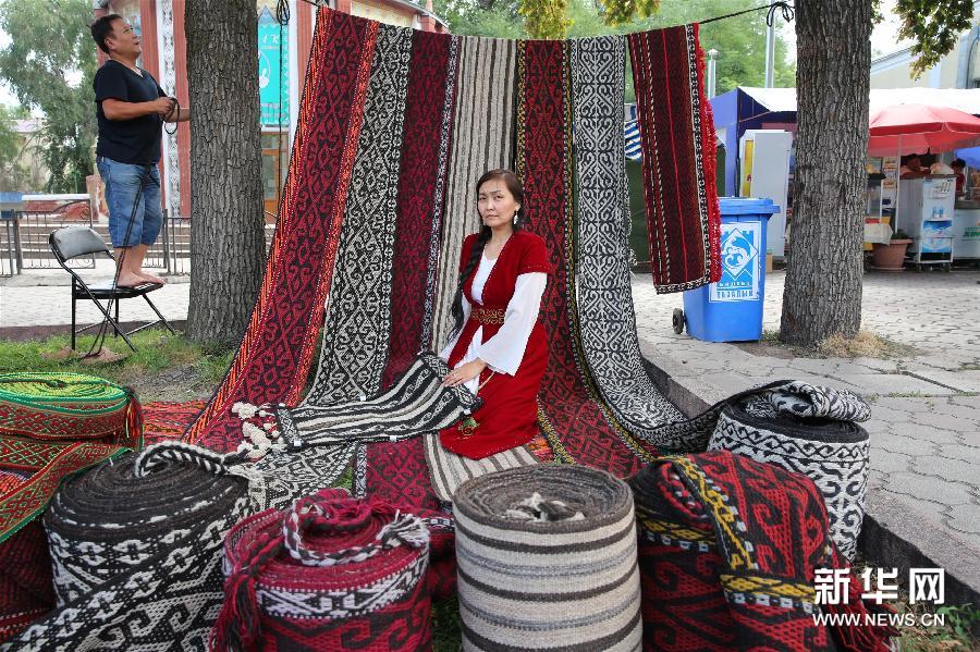 7月31日,在吉尔吉斯斯坦首都比什凯克,参展者展示手工地毯。