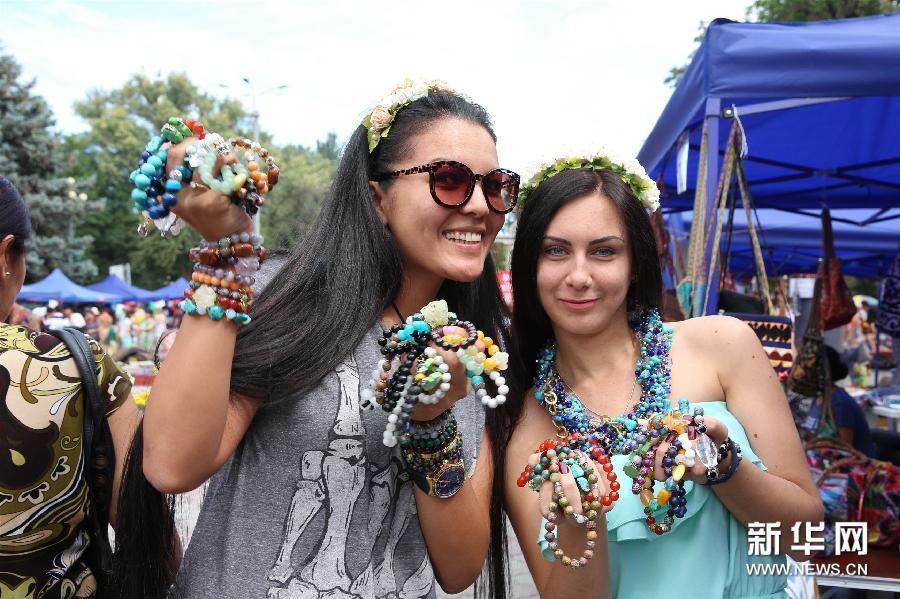 7月31日,在吉尔吉斯斯坦首都比什凯克,两名年轻人展示手工艺品。