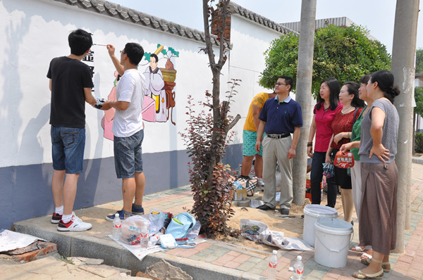 民进唐山师范学院二支部会员、唐山师范学院音乐系教师李占红,美术系教师董怀晶、刘田、徐亮、孙贺元,唐山十中美术教师陈杨及唐山师范学院美术系大学生志愿者冒着高温酷暑,手持彩笔携手在村循环文化墙上绘制宣传画,美化乡村环境、弘扬中国传统文化?;疃诩?,杨方等一行领导向村干部详细了解了村民生产生活情况,慰问了8户因病致贫群众,并送去了价值2000元的慰问品。