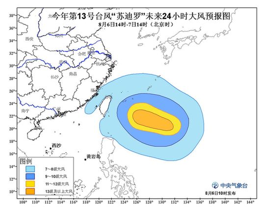 据中央气象台消息,今年第13号台风“苏迪罗”的中心8月6日上午已达我国台湾省花莲市东偏南方大约960公里的西北太平洋洋面,中心附近最大风力14级。