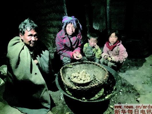 此时,古次一家正准备吃午饭,一家人缓缓地围向箩筐中一小笸箩大大小小的土豆,这是他们一年四季最主要的食物。