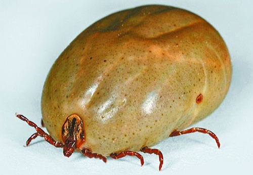 蜱也叫狗豆子、草爬子,多数蜱种的宿主很广泛,通常寄生在鼠类、家畜等体表,多选择皮肤较薄、不易被搔动的部位,有些种类侵袭人体。蜱吸饱血后,虫体膨胀后如黄豆大小。一般呈红褐色或灰褐色,长卵圆形,背腹扁平,从芝麻粒大到米粒大不等。
