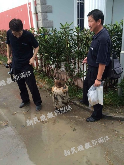 图说:消防人员对酒店内其他液化气瓶进行检测封存。新民晚报新民网记者戴天骄摄