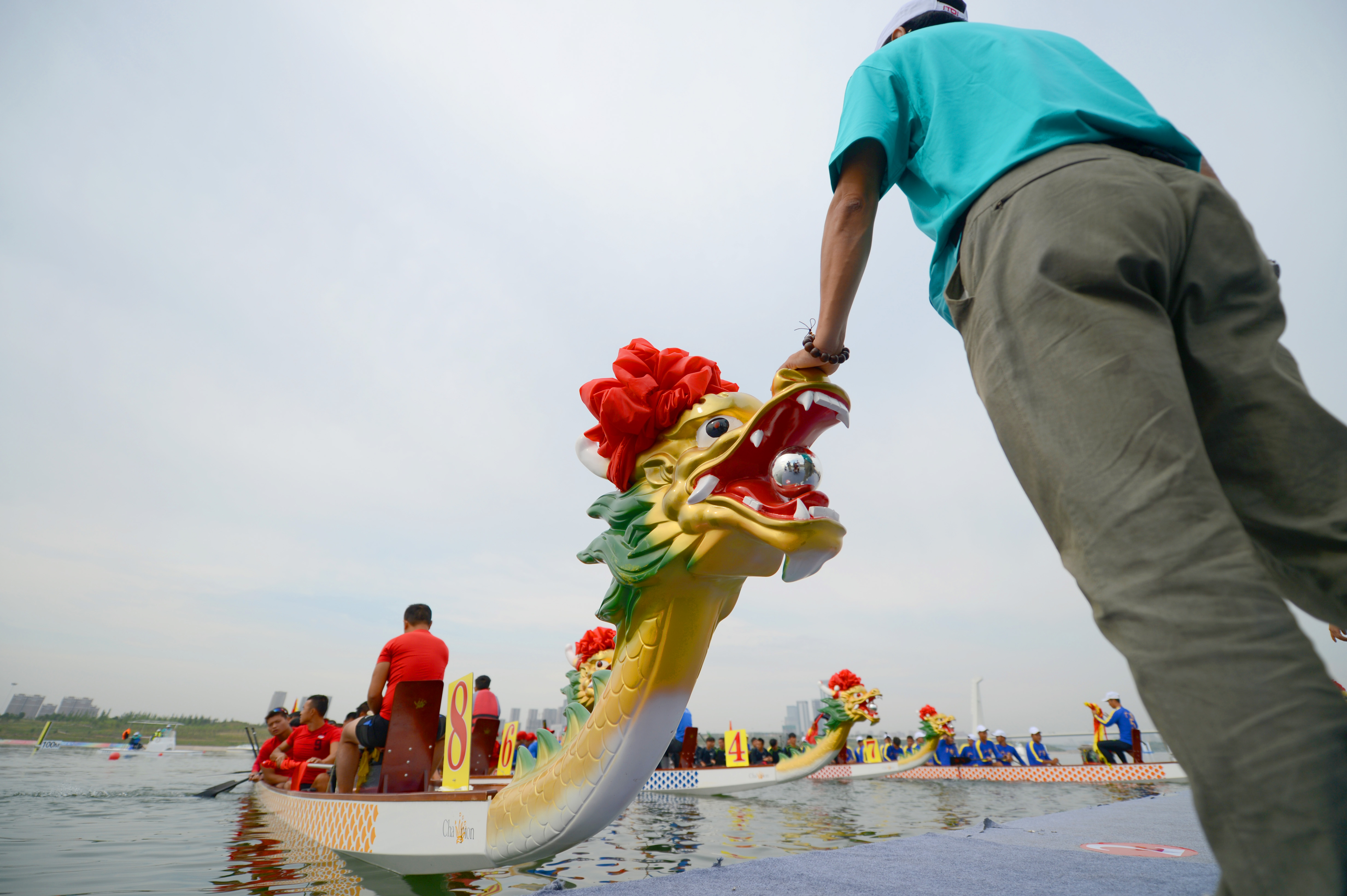 工作人员助力龙舟下水 人民政协报记者 田福良\摄